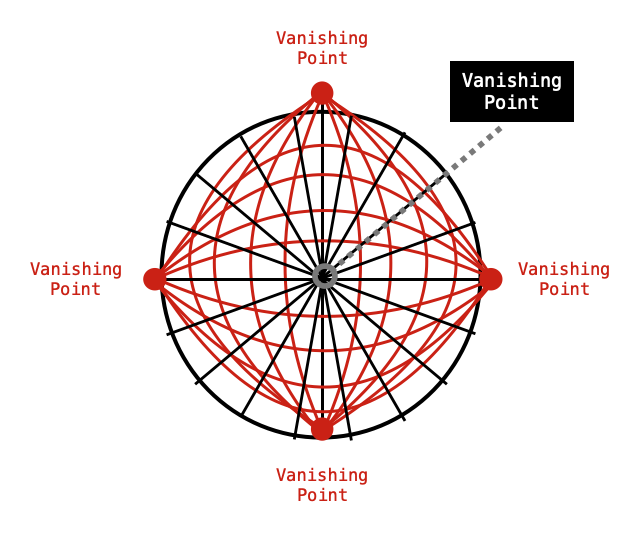 Again, there are a couple of different ways to achieve four vanishing points but it almost seems cheeky to just pop two copies of three-point perspective next to each other but it works. This process does start with six points and the moment the two equatorial (or mirrored) vanishing-points merge, curvature is achieved and we get four-vanishing points.