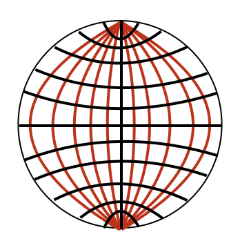 In four-point perspective we merged one set of grid lines and for the fifth-point, Termes merges the other remaining set of lines. This gives us a stereographic projection for half a sphere.