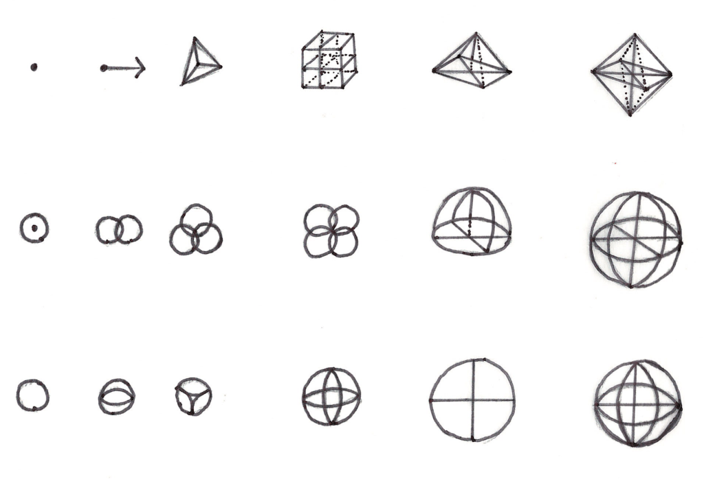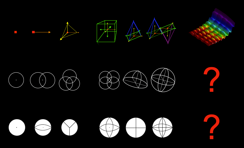 There is an another nomenclature that can be used for the geometries: (1) a simple object, exhibiting (2) external or simple movement, acquiring (3) simple magnitude that transforms into (4) a complex object, characterized by (5) complex internal motion tied with (6), a complex magnitude, a progression culminating in (7) a complex system that is stable and independent of a power source.