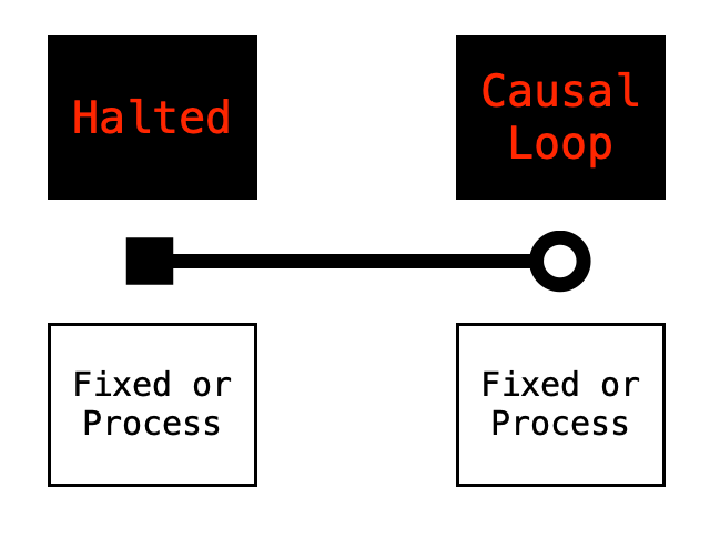 These top or major concepts never change and the endpoints of the line was selected to represent them. The bottom labels represent minor variations of the major concepts. These minor concepts alternate each time a sub-layer is established, regardless of it being labeled as Halted or Casual Loop.