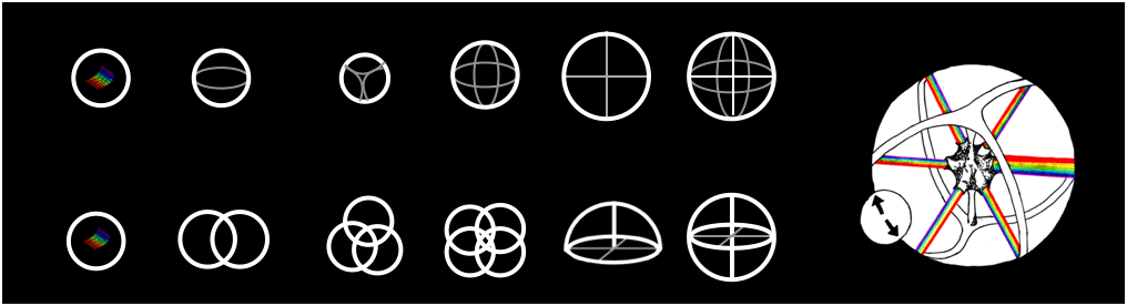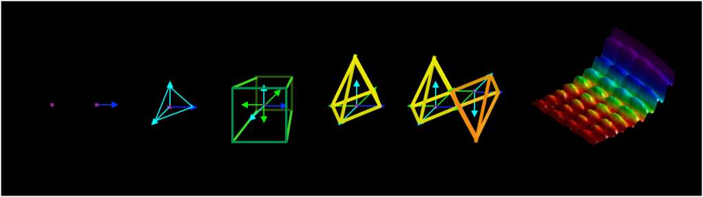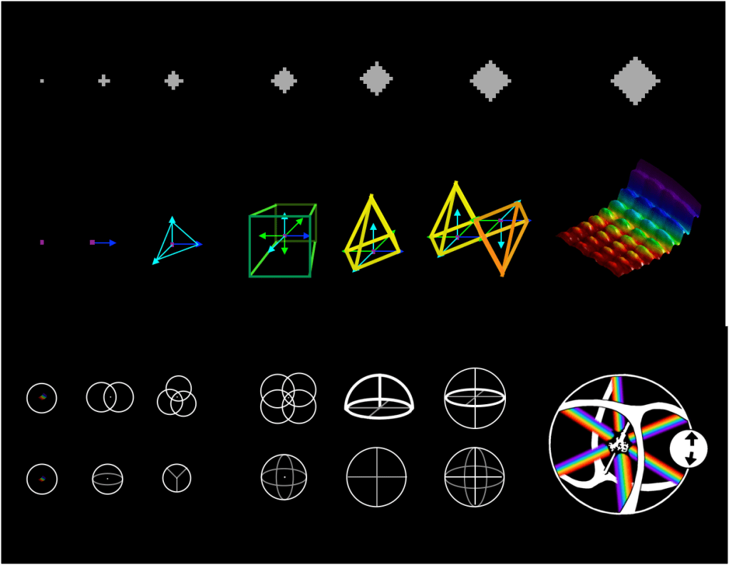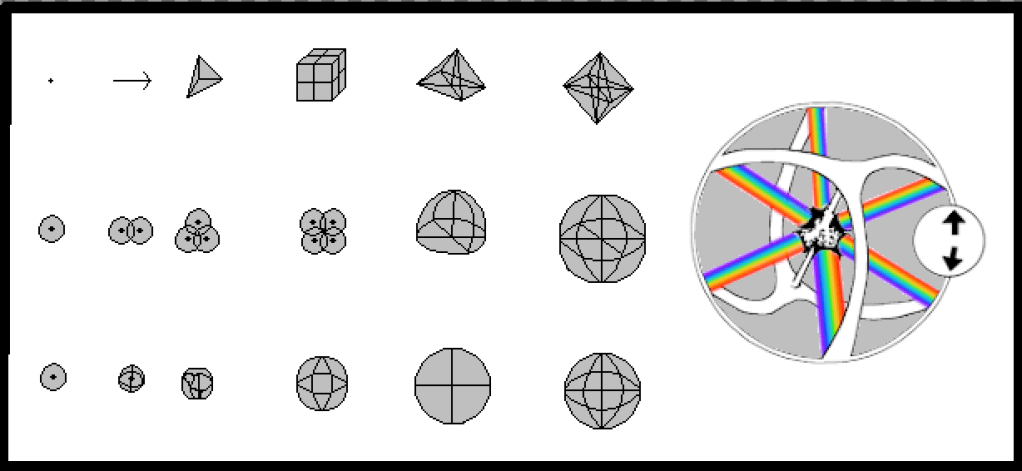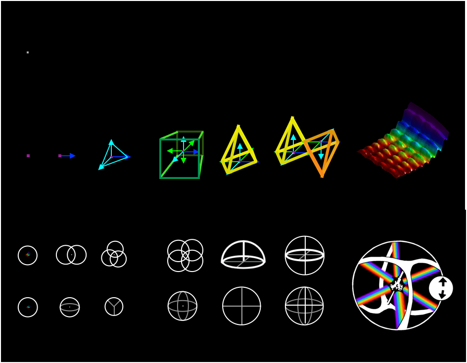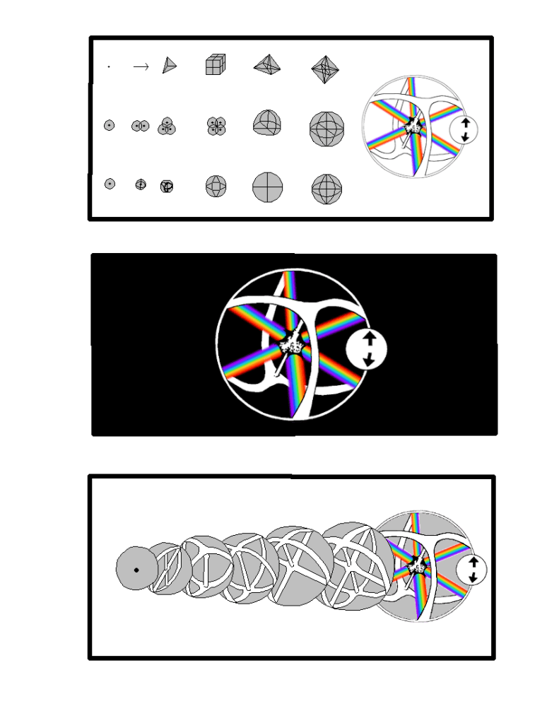 The Forms of Light outline a Geometric Primer for Electromagnetism. This allows for a simple mathematical visual that captures very complicated ideas without algebra such as this related image called TURTLE POWER. Fun, eh? But geometry and logic all the way. Once The Forms of Light are understood, it becomes a tool to organize things made from Light. Light is in everything (from people to planets) and these projections become the basis for additional original art and scientific ideas.